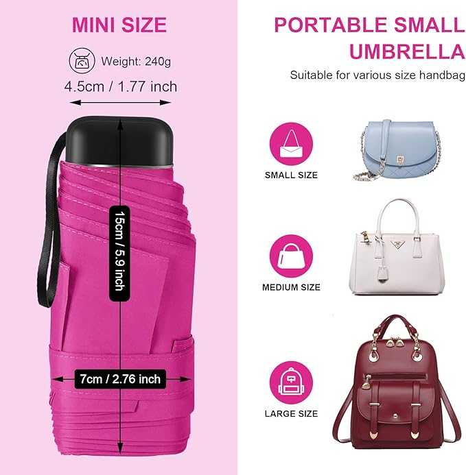 - Light and Compact:This mini purse umbrella with small case weighs only 0.52 lbs and length:5.9in, fits perfectly in your backpack, purse and pockets
