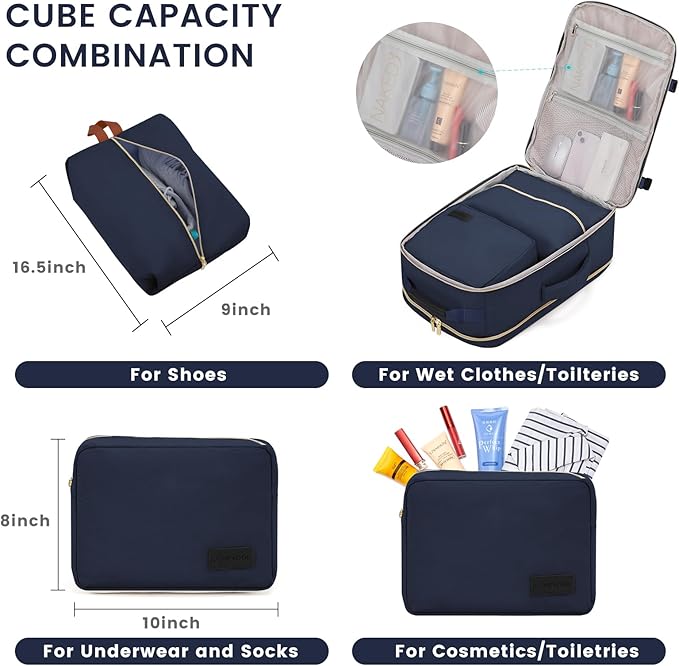 - 👔【WELL-DESIGNED COMPARTMENTS】This travel backpack has 4 main compartments and 3 packing cubes supplied, which enable you to keep your things in order. Your shoes, toiletries, and underwear can be placed in separate packing cubes. There is also a side pocket for bottles and umbrellas. A separate dry and wet compartment allows you to store wet towels and toiletries.