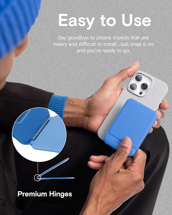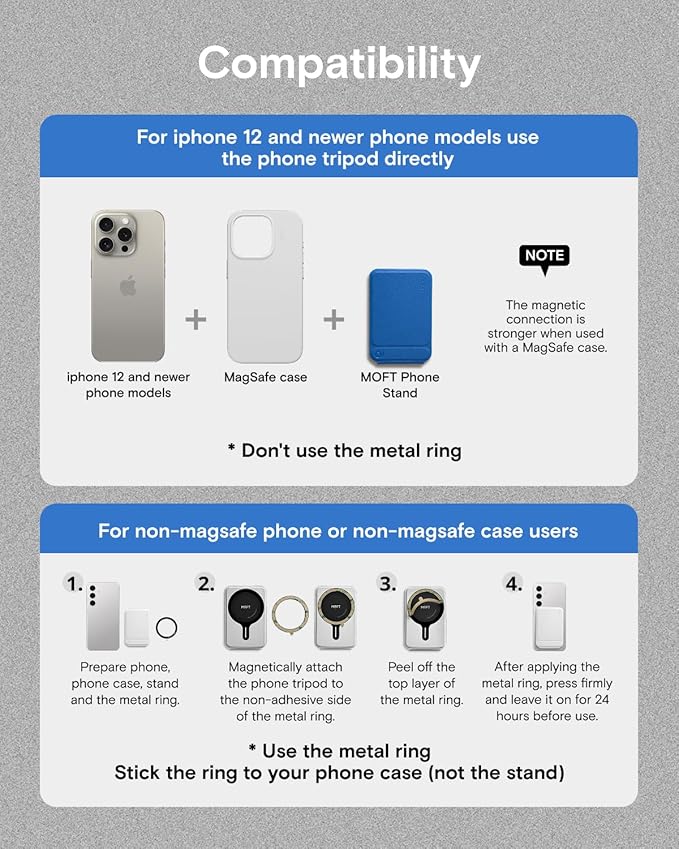 - Universal Compatibility: MOFT Phone Tripod fits iPhone 17/16/15/14/13/12 series and MagSafe cases. For other devices (such as Samsung) and non-magnetic cases, the phone stand can be attached using the included metal ring. Please check the product dimensions (3.8in X 2.5in X 0.27in) to ensure it fits the back of your phone without obstructing the camera. The slim design ensures your phone’s lenses stay unobstructed-perfect for Instagram-worthy shots at cafes, parks, or business events.