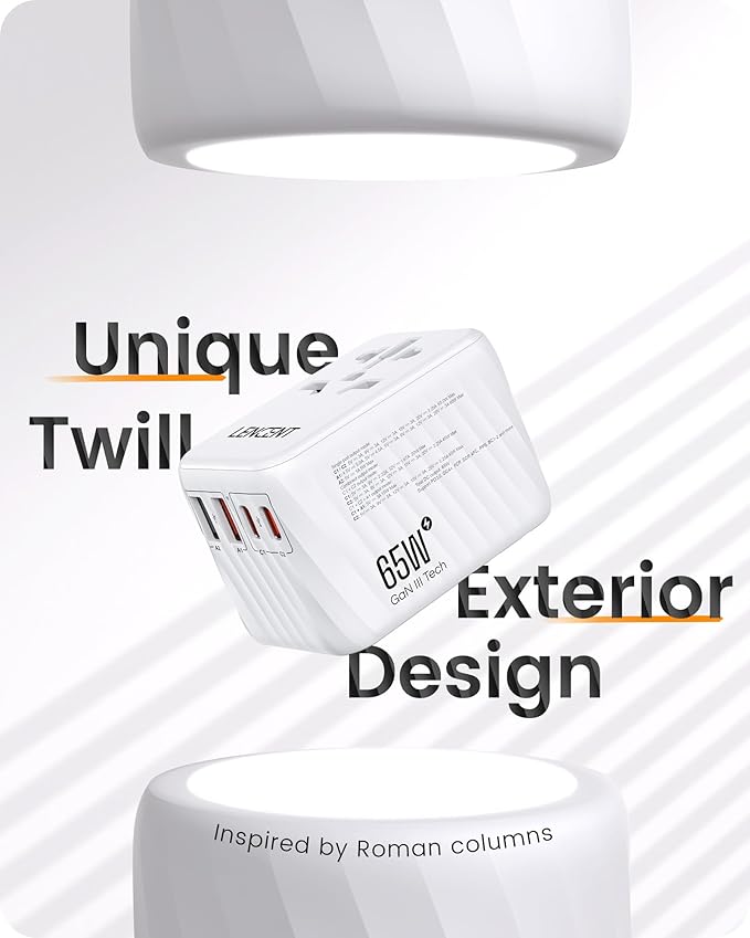 LENCENT Universal Travel Adapter, 65W GaN International Fast Charger with 2 PD3.0 Type C+2 QC USB A, Worldwide Power Adaptor for Phones,Laptops, All in One Travel Essentials for EU/USA/UK/AU, White