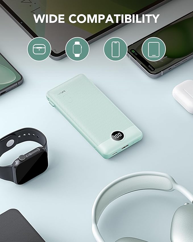 - [High Capacity & Universal Compatibility] Boasting a 10,000mAh capacity, this USB-C portable charger can power your devices 2.5 to 4 times on a single charge, depending on the device. It's compatible with iPhones, Android devices, and most USB-C enabled gadgets using the built-in cables.
