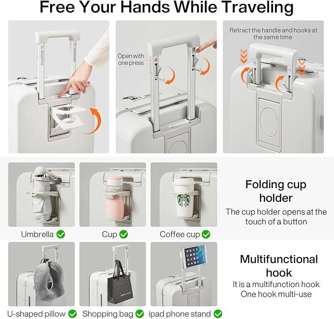 - 【Multifunctional Holder Design】Especially designed water cup holder, phone holder located in top of luggage and the handle hook. If you enjoy drinking coffee or playing with your phone while traveling, it will be the perfect choice
