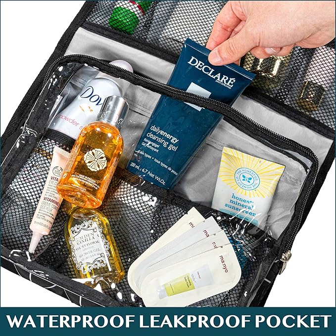 - PADDED MAKE UP BAG KIT: The toiletry case bag for men has foam padding that protects toiletries container, shampoo bottle during flying, roadtrip, and plane. The toiletry bag kit also has elastic bands that secure makeup brush, face spray, lipstick, shaving razors. One waterproof compartment for wet toiletries. Clear pockets let you see all essentials clearly and is tsa approved. This large hanging toiletry bag holder for women will protect all gear, cosmetics, and travel gadgets.