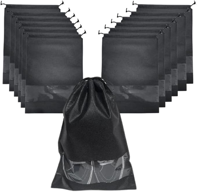 Travel Shoe Bag for Packing in Suitcase, Organizing & Storage (12 Pack) - Reusable Dustproof & Water Resistant Pouch Protectors for Accessories, Laundry & Toys with Clear Window & Drawstrings. (Black)