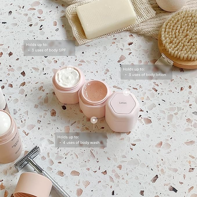 Cadence Travel Containers - Body Care Capsule Set - Magnetic Containers with Lids,Carry On Travel Essentials for Women/Men - 3 Flex Mediums (1.32oz) - Body Wash, Lotion & Sun Icon Labels - Petal