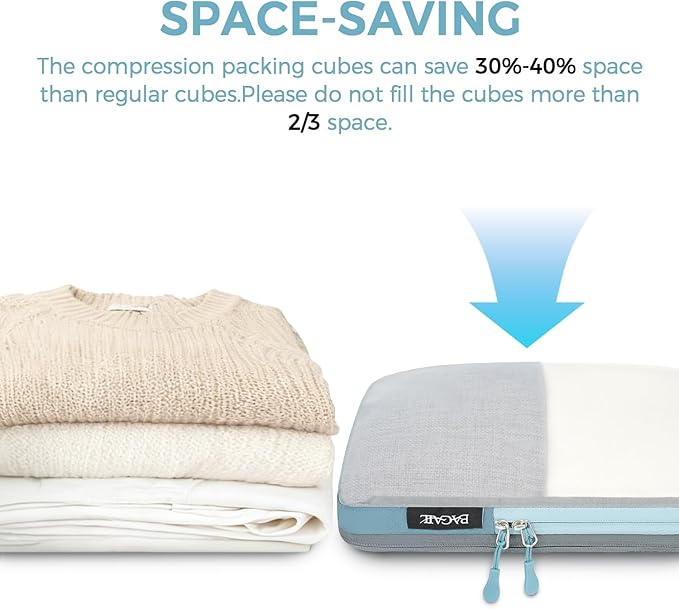 - Space Saving: Save up to 50% space by compressing the packing cubes via the exterior compression zippers; And all the zippers we use are SBS zippers, it makes sure the packing organizers could be opened and closed easily