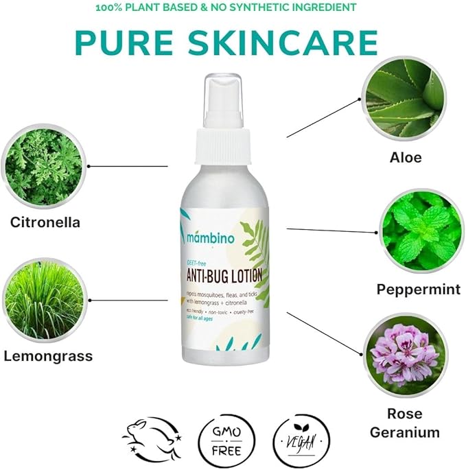 Mambino Organics Anti-Bug Lotion, DEET-Free, Organic Bug Repellent with Essential Oils, Nourishing Travel-Size Lotion for Babies, Kids, Adults, Safe for Camping, Outdoors & Sensitive Skin, 4oz