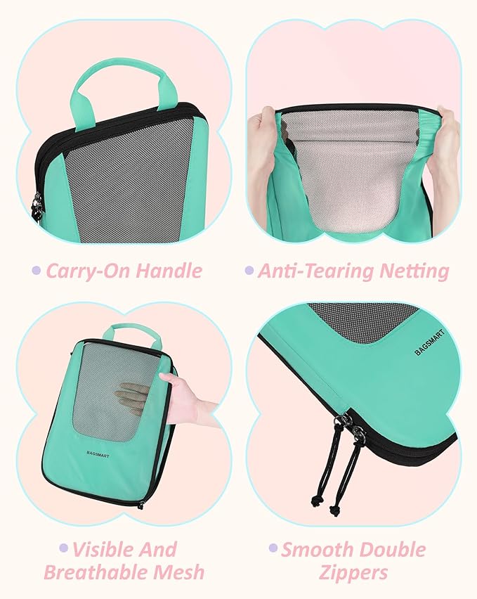 - Compression Packing Cubes - Are you fed up with the travel kind of messy suitcase? Travel with BAGSMART PACKING CUBES and they make a world of difference. The 6-piece packing cubes contains 4 travel cubes + 1 laundry bag + 1 shoe bag, keeps your outfits in separate compression cubes, and makes your luggage clean and neat while traveling