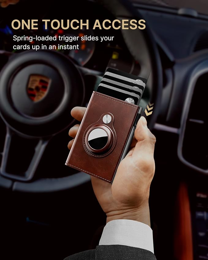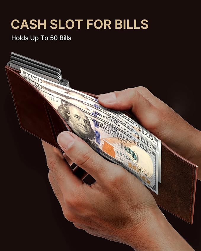 - 【QUICKEST ACCESS】Instant card access at the tap of a button by a single hand. Stores 10+ cards and 50 bills total. The pop-up aluminum card holder stores 6-7, the built-in cash slot stores 50 bills, and the ID window for driver's licenses.