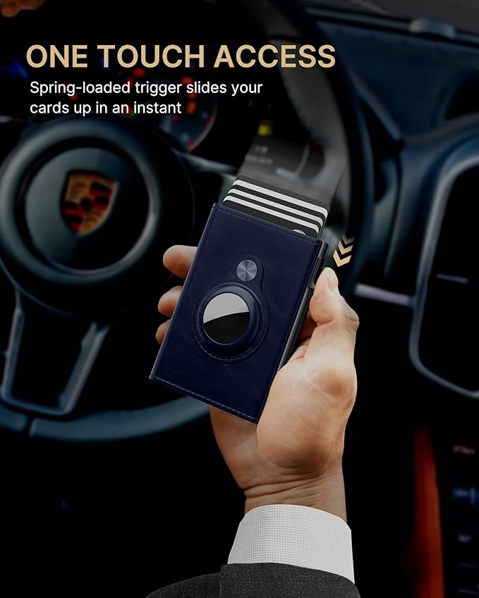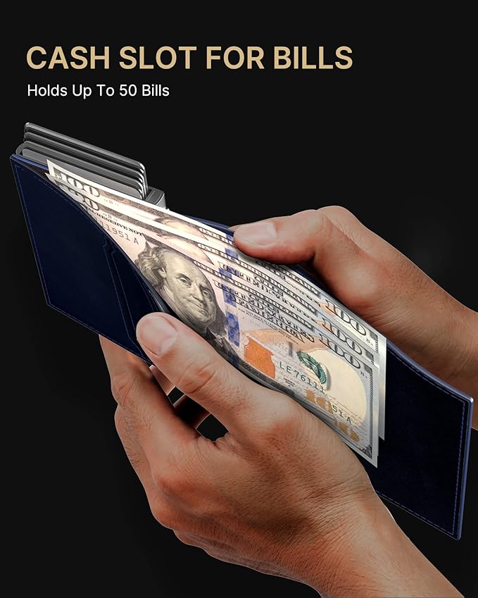 - 【QUICKEST ACCESS】Instant card access at the tap of a button by a single hand. Stores 10+ cards and 50 bills total. The pop-up aluminum card holder stores 6-7, the built-in cash slot stores 50 bills, and the ID window for driver's licenses.