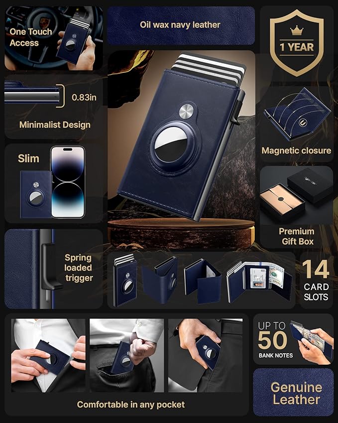 typecase Mens Wallet Card Holder for AirTag: Leather Smart Wallet for Men Compatible with Apple Air Tag, RFID Blocking, Slim, Minimalist - 9-14 Card Capacity | ID Window | Cash Slot (Navy)