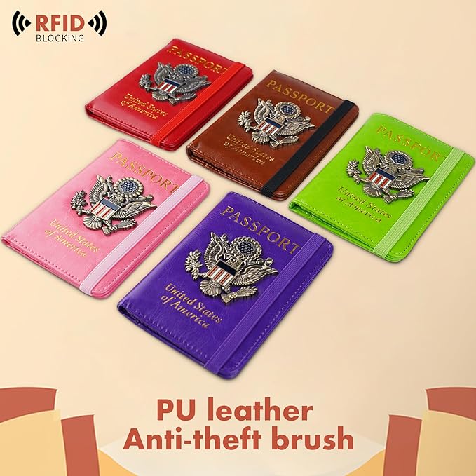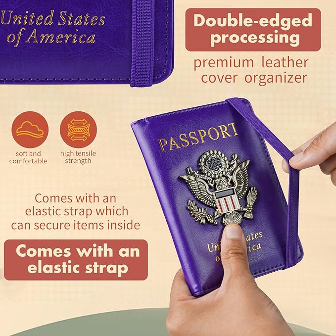 - ★【RFID blocking -travel wallet】RFID Passport holder case is made of Faux Leather and RFID-blocking shield materials. RFID Blocking security feature ensures that your personal information remains safe from potential theft while you travel.Passport holder for family can put necessary things, makes travel and business trips a breeze.The emblem on the front is cool,If we get compliment for trip,of course we need to spread the song all over America.