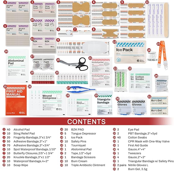 - Included Components : Antiseptic, Bandage, Burn Ointment, Cold Pack, Tourniquet