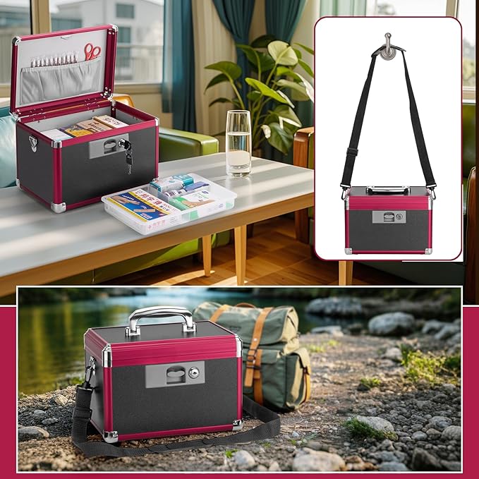 - PERFECT SIZE: Measuring 13.4 x 7.6 x 8.2", black & red, unique lock with 2 keys + shoulder strap. our locking medicine box can store up to 16-18 pill bottles or any other small first aid