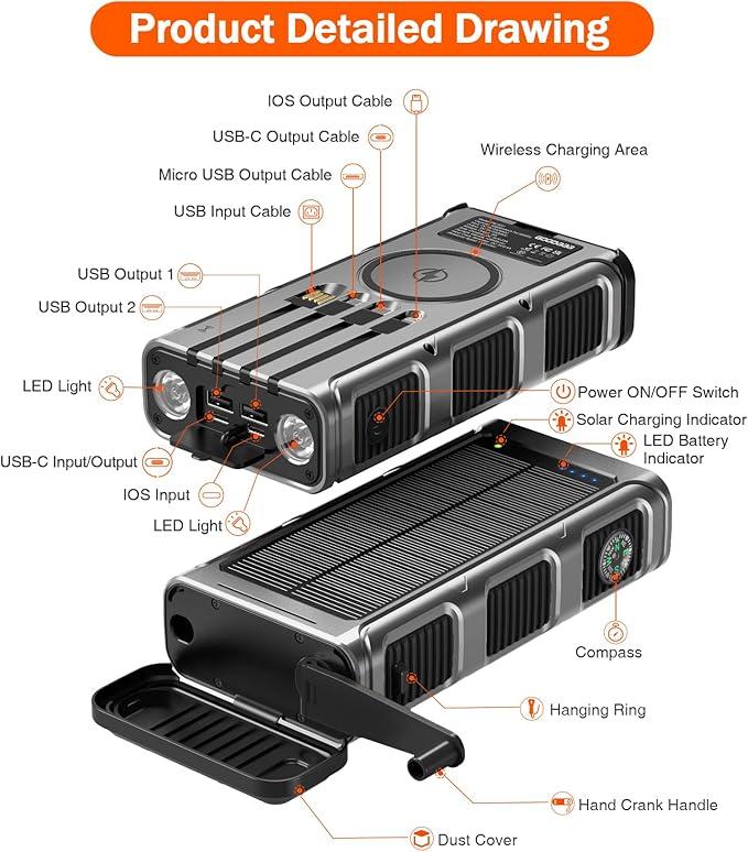 - Special Feature : Built In Cable, Flashlight, Hand Crank Generator, Over Charging Protection, Wireless Charging