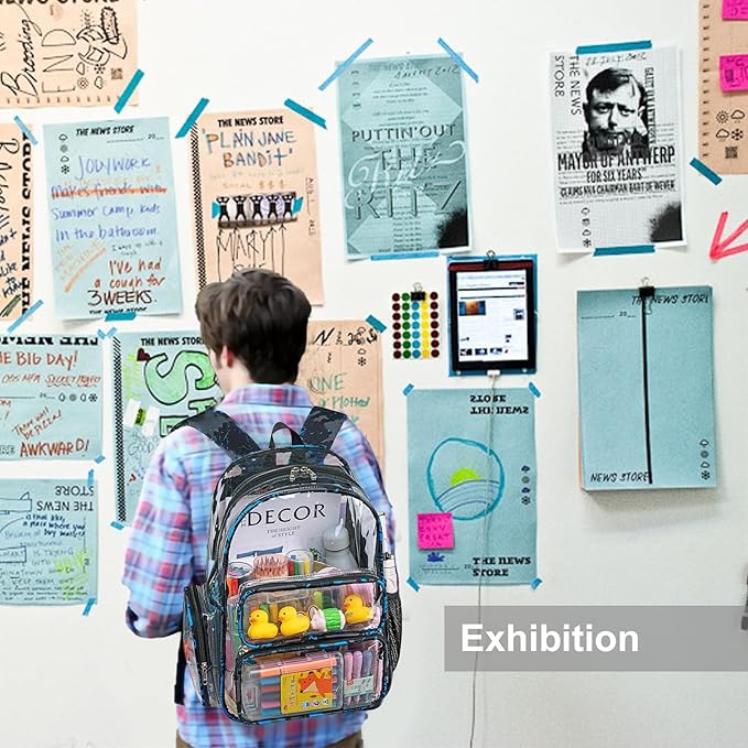 - Large capacity & 6 pockets:clear book bag measurement: 17"(H)*12.5"(L)*6(W),Well made with quality zippers.clear back pack with 1 large double zipper main compartment, It's big enough for many binders, books and 15.6" laptop; 2 front zipper pocket to store color pencil, tape,glue stick,keys, etc; 2 side pockets:1 stretchable mesh pocket for water bottle or umbrella , and another zipper pocket for personal items.
