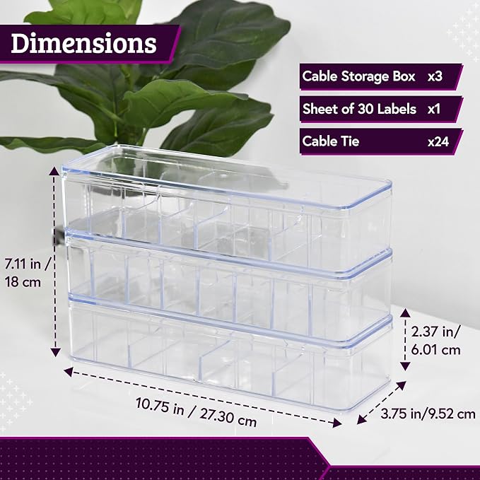 - The package: Includes 3 pcs Cord Organizer Box with Lids, 24 White Rubber Cable Ties, 1 Label Sheet with 30 Images of USB types cables. Our Cord Management Box helps to keep your USB cables and similar accessories in our acrylic cable management box for safe keeping and easy retrieval from your drawer. This wire organizer box comes with a sheet of labels for easy identification of your USB cables. Each Box measures (10.75” x 3.75” x 2.38”).