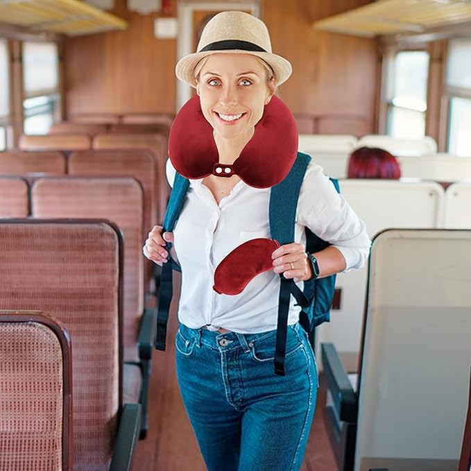 Pure Memory Foam Travel Pillow Set for Adults - Comfortable & Removable Machine Washable Cover, Neck Support Pillow Airplane Travel Kit with Eye Mask for Portable Plane Accessories -Wine Red
