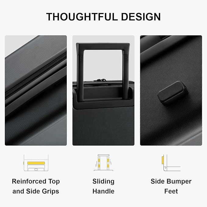 - More Effortless Traveling: This suitcase equipped with 8 silent universal spinner wheels and aluminum telescoping ergonomic handle with 4 levels for effortless control and maneuverability; Equipped with top and side easy grab handles; Bumper feet on side for protecting the case