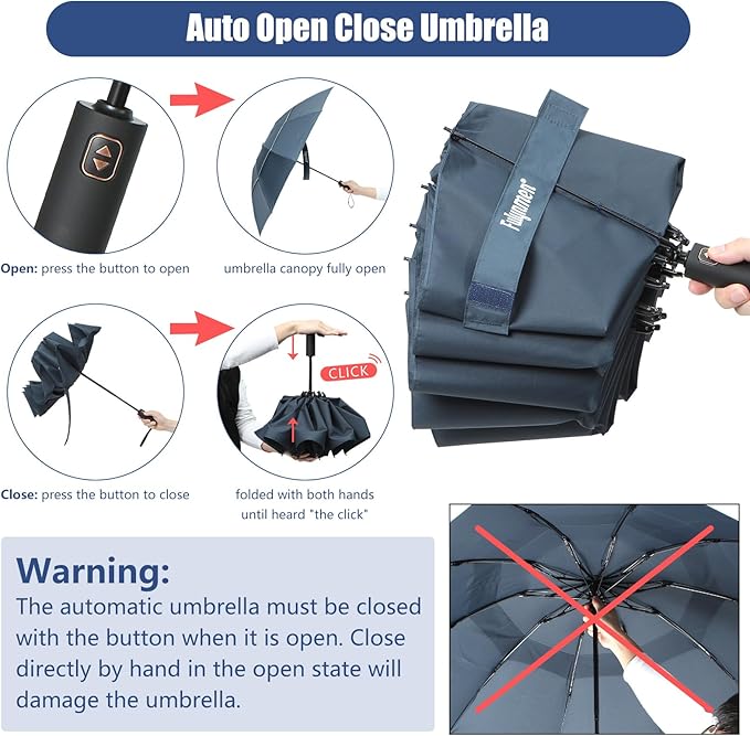 - Auto Open & Close: This folding umbrella can be one hand operation and provides great convenience to open or close it when you hold a lot of bulky items or get in/out of the car. Automatically open with one press of a button on the ergonomically designed fully automatic umbrella handles in a second, giving you the ability to quickly & easily open or close your umbrella.