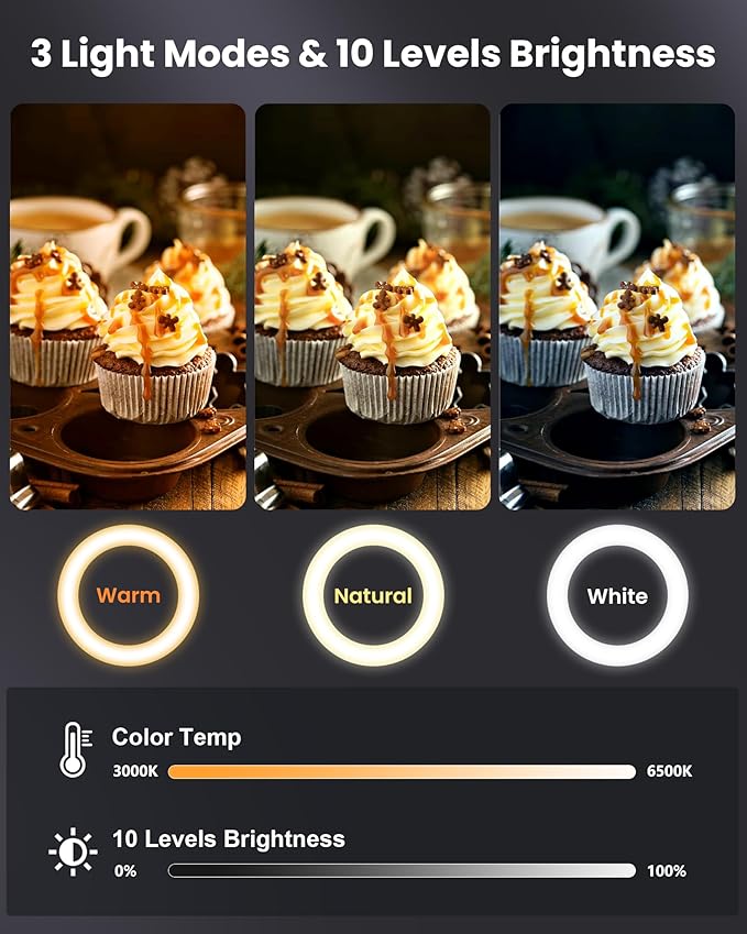 - Pro-Quality Lighting with 30 Settings: Customize your lighting with 3 color modes (Warm, Natural, Cool), each with 10 brightness levels. A high CRI (>95) ensures vibrant, true-to-life colors—It's a must have video equipment for YouTubers, TikTokers, and content creators