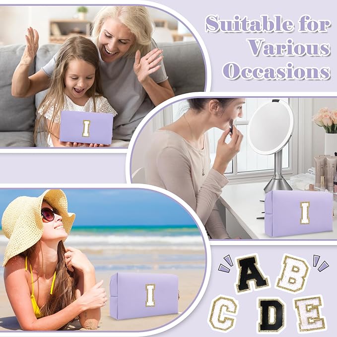 Personalized Makeup Bag Initial A-Z Preppy Patch Bag,Small PU Leather Travel Cosmetic Bag Pouch with Zipper,Purple Cute Toiletry Bag,Gift Ideal for Teen Girls Women Birthday Friend Mom,Latter I