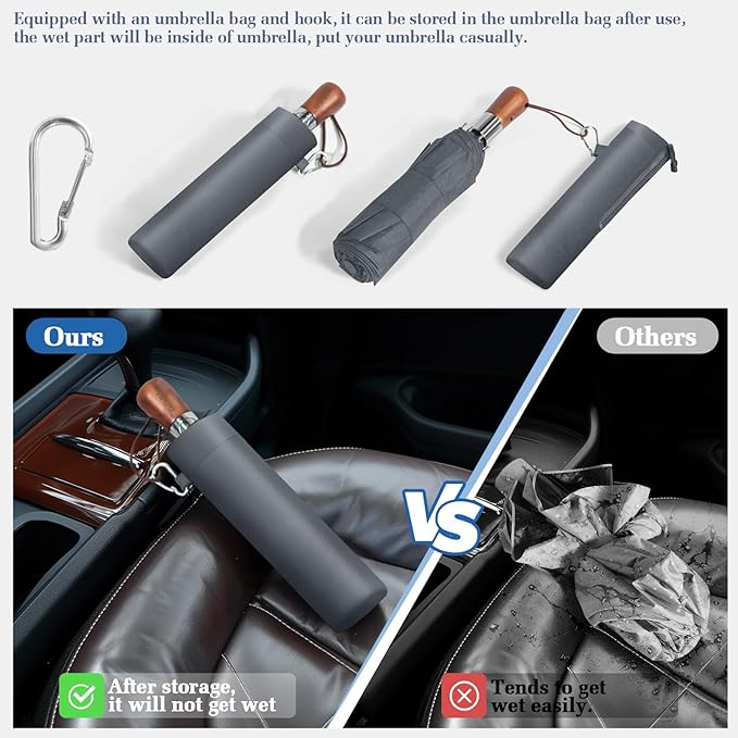 Umbrellas for Rain, 47" Large Windproof Travel Umbrella, Triple-Layer Vented Canopy, 10 Fiberglass Ribs, Auto Open Close Compact Umbrella, Wooden Handle, Heavy Duty for Commute, Gifts for Men & Women