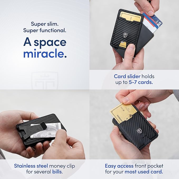 - ππππππππππ, πππ ππππππππ - This slim wallet for men holds up to 6-8 cards (depending on card thickness) and fits seamlessly into your jeans, suit pants, blazer or shorts pockets with its trim dimensions of only 3.8 x 2.6 x 0.75β and light weight of 3.85 oz. The stainless steel money clip allows you to clip folded bills securely on the backside of your credit card holder