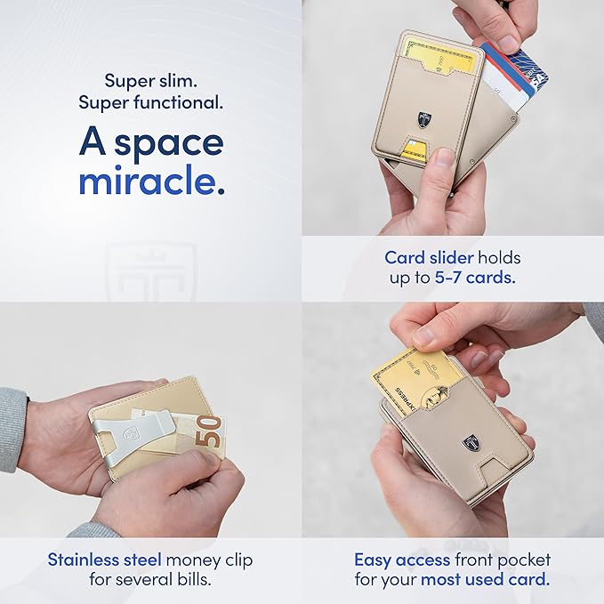 - ππππππππππ, πππ ππππππππ - This slim wallet for men holds up to 6-8 cards (depending on card thickness) and fits seamlessly into your jeans, suit pants, blazer or shorts pockets with its trim dimensions of only 3.8 x 2.6 x 0.75β and light weight of 3.85 oz. The stainless steel money clip allows you to clip folded bills securely on the backside of your credit card holder
