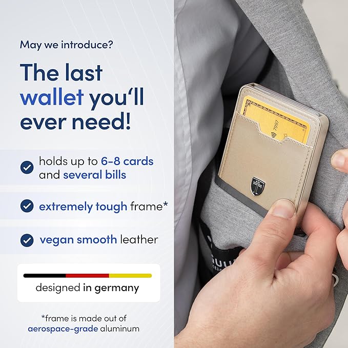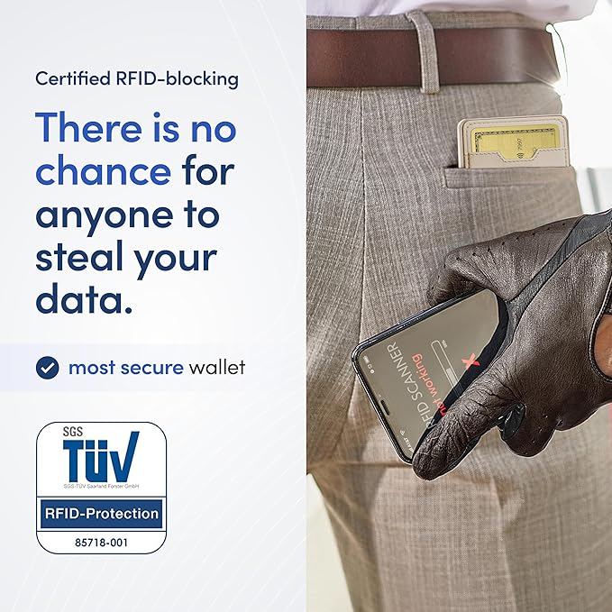 - ππ ππ ππππππππ - The RFID blocking function of our front pocket wallet has been certified by the independent institute TΓV Germany for completely blocking the RFID frequency 13.56 MHz. This protects your cards in the aluminum frame and also the front pocket from being read