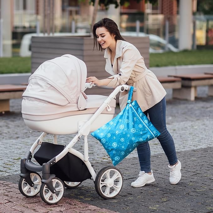 - Material: Outer layer of wet bags are knitted printed flat cloth, inner layer is attached with breathable and waterproof coating, soft to touch and silky feeling, safe to preserve baby products, not easy to break, light in weight, easy for you to take.