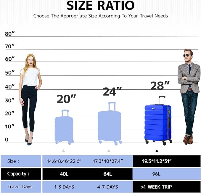- [Checked-Large 28 Inch] The 28-inch suitcase meets the functions of boarding, travel, and daily storage. Size: 19.5*11.2*31 inches. Capacity: 96L.