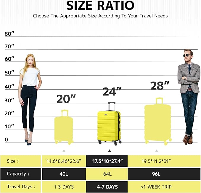 - [Checked-Medium 24 Inch] The 24-inch suitcase meets the functions of boarding, travel, and daily storage. Size: 17.3*10*27.4 inches. Capacity: 64L.