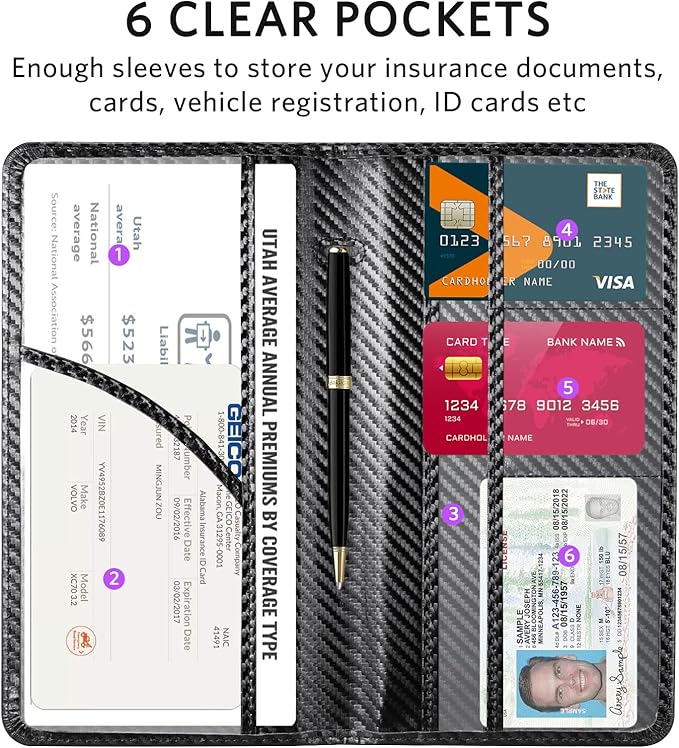 - 6 COMPARMENTS: Comes with 3 large pockets for insurance documents, vehicle registrations cards and other valueable information. And 3 small pocket for driver's license, ID cards, business cards, key contact information cards.