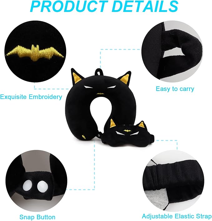 Superhero Travel Pillow for Kids & Adults with Sleep Eye Mask, Memory Foam U-Shaped Neck Pillow with Washable Cover, Soft Head Support Travel Accessories for Airplane Car Train Bus Recline, Black