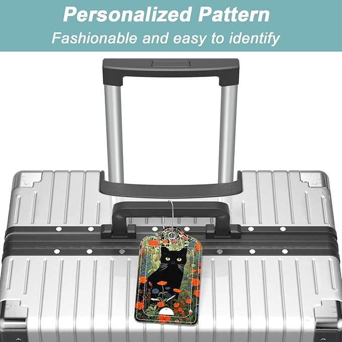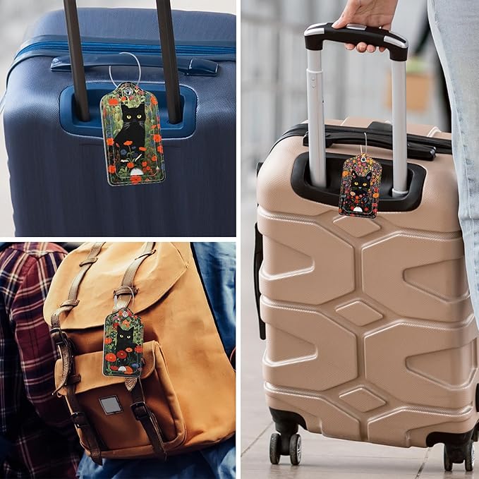 Rimilak 3 Pcs PU Leather Luggage Tags for Suitcase, Travel Cruise Luggage Tag with Privacy Flap, Name ID Label and Metal Loop for Women Men Baggage Handbag School Bag Backpack, Black Cat