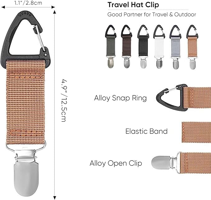 - Travel Hat Clip: Still have a frustrating time not knowing where to hang your hat when traveling outdoors? Travel hat clip can solve your problem. Our travel hat clip is suitable for all styles of hats, you can use the travel hat clip to attach your hat to your handbag, luggage or jacket. It's easy to take and hang your hat at any time of the journey.