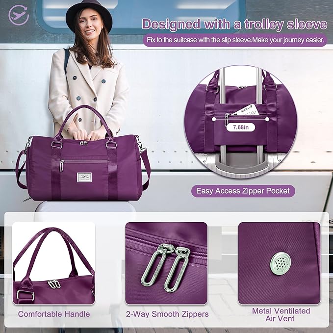FIORETTO Womens Gym Tote Duffle Bag with Toiletry Bag, Sports Duffel Overnight Hospital Workout Carry on Bag for Girls with Wet Pocket & Shoe Compartment, Ideal for Travel, Swimming, Dance Purple