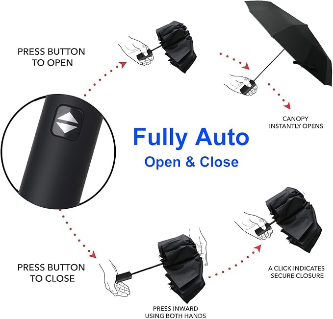 - Automatic Umbrella: Easy to open and close, with push button auto-open and auto-close feature. This folding umbrella where you press a button and it automatically open, then close when you press it again