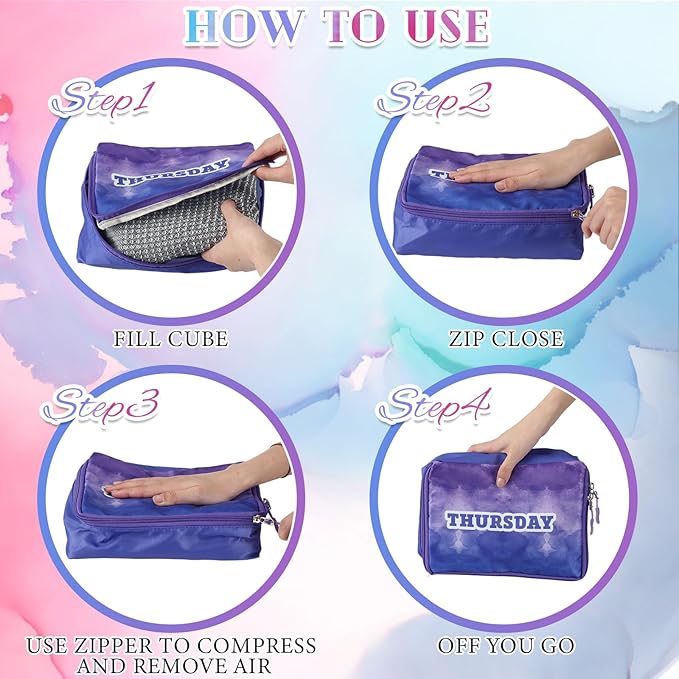 - Suitable Size for Use: the packing cubes measure about 9 x 6.7 x 3.5 inches, and printed with Monday to Sunday markings for your convenience throughout the week; They can hold most of your essentials from clothes, toiletries and more