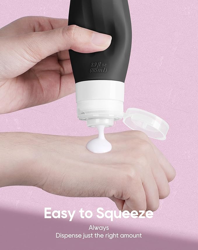 - 【SILICONE & SQUEEZABLE】Made of food grade Silicone which is BPA free and non-toxic, feel soft, flexible and comfortable instead of hard like traditional plastic travel bottles. The silicone is thick and durable but can be squeezed easily