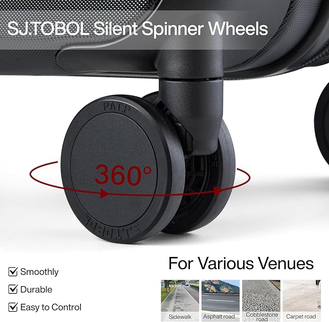 - 【Reliable Handling & Effortless Mobility】 Luggage sets with spinner wheels multi-directional are SJ. TOBOL universal design with wear-resistant that rolls extremely easily to make it carry through the airport smoothly and big enough to ride smoothly over uneven surfaces, like asphalt road, sidewalks, grasslands, etc,.The aluminum retractable handle is easy to push up and down with just the press of a button for 4 height option, offers you with a comfortable travel experience.