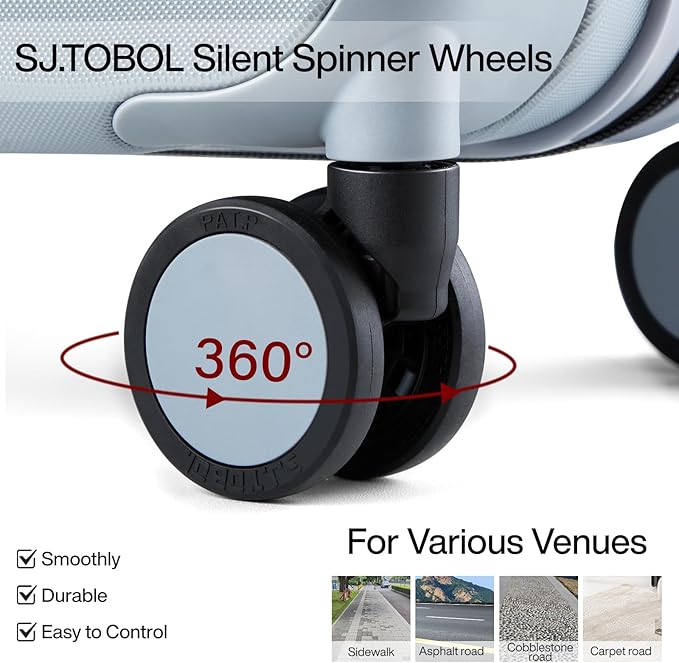 - 【Reliable Handling & Effortless Mobility】3 piece Luggage sets with spinner wheels multi-directional are SJ. TOBOL universal design with wear-resistant that rolls extremely easily to make it carry through the airport smoothly, suitcases with wheels are big enough to ride smoothly over uneven surfaces, like sidewalks, grasslands, etc,.The aluminum retractable handle is easy to push up and down with just the press of a button for 3 height option, offers you with a comfortable travel experience.
