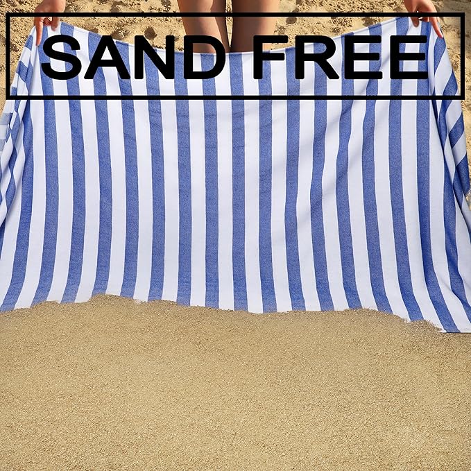 - 【SUPER SOFT&SAND FREE】 Our blue and white towels beach cool your skin with silky smoothness while providing extra care and protection from the elements that has natural aloe vera extract embedded in its fabric and is released every time you use it. So quick dry beach towel is super soft for touching with sleek fibers woven from turkish cotton.The sand free beach towel can be directly covered on the sand or grass, when not in use you can quick shake off the sand because of smoother surface