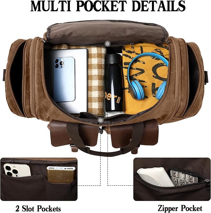 - 【Multi pocket 】The travel duffel bags have double genuine leather pockets on the front, connected with magnetic snaps for quick access to essentials. The design of duffle bag is a main compartment, 2 front pockets, 1 back zippered pocket, 2 side pockets. For easy storage, there is a large zippered pocket and 2 slot pockets inside the travel bag