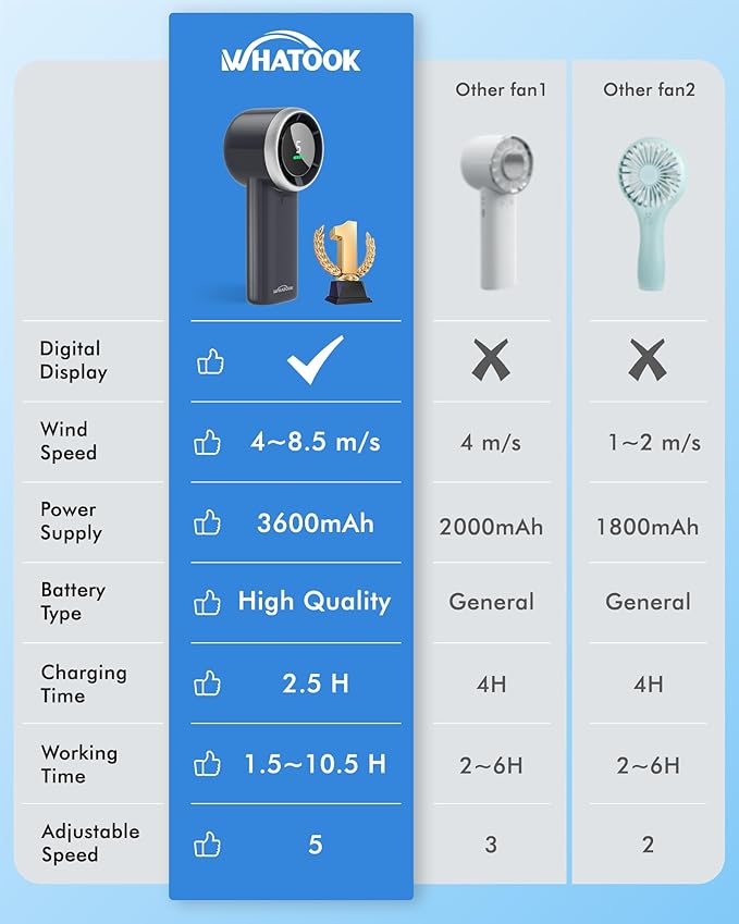 - LONG LIFE & FAST CHARGING: 6-10 hours of daily use, whatook fan one gear wind power equal to other fans 2-3 gears, with 2A fast charging cable, 2.5 hours full of 80% charge