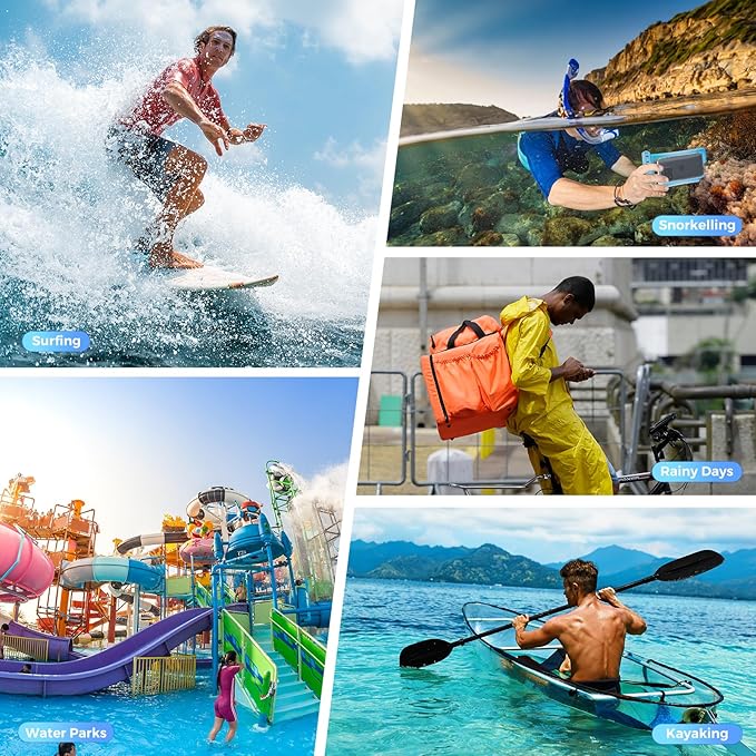 - Suitable for most smartphones up to 7 inches diagonal size such as iPhone 17/Air 16 15 14 13 12 Pro Max Xs Max XR X 8 7 6S Plus SE/Galaxy S24 S23 S22 S21(Certain big screen phones need to remove protective case); Credit card wallet money waterproof dry bag for ship, pool, fishing, swimming, boating, kayaking, snorkeling and water park activities
