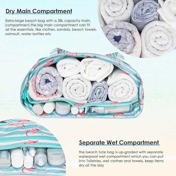 - Travel Essentials for Beach Vacation: It is an extra large beach bag that measures 17.7"L x 15.75"H x 8"W and holds everything you need for a day at the beach/pool; With smart design waterproof wet compartment to hold dirty clothes and wet towels after sports, keep other items dry all day; Besides, this beach bag also gives an extra makeup bag to store cosmetics/toiletries