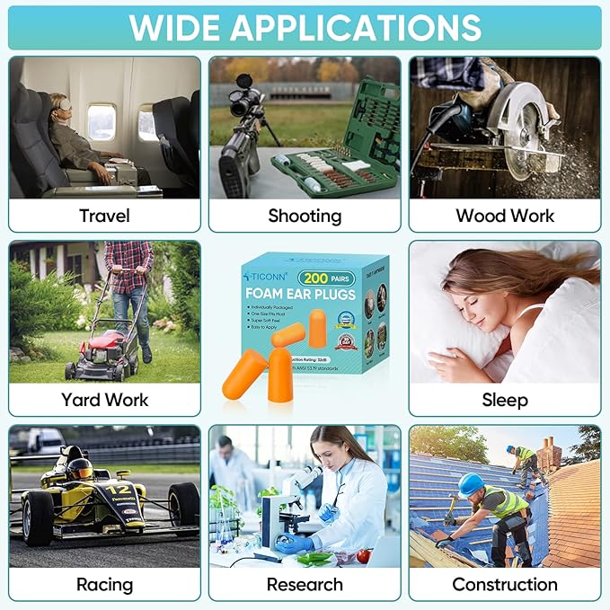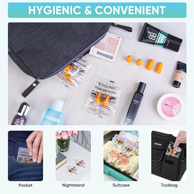 - [PORTABLE AND CONVENIENT] Made small, lightweight, and individually wrapped. TICONN earplugs are easy to carry around in a pocket or purse. They can be used anytime, anywhere, and are ideal for use while traveling, sleeping, job site, or studying. This makes them a convenient solution for anyone looking for ear protection.