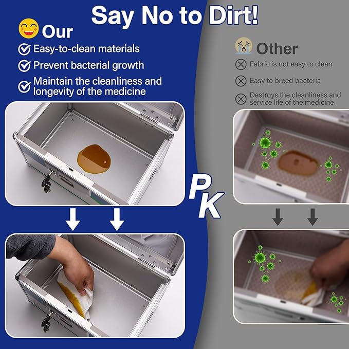 - STURDY AND DURABLE: Made of high-quality aluminum alloy and MDF, detachable plastic tray, our lockable drugs storage box is constructed with 4 steel corners, aluminum reinforcement, and an extra strong key lock to ensure your materials are safe